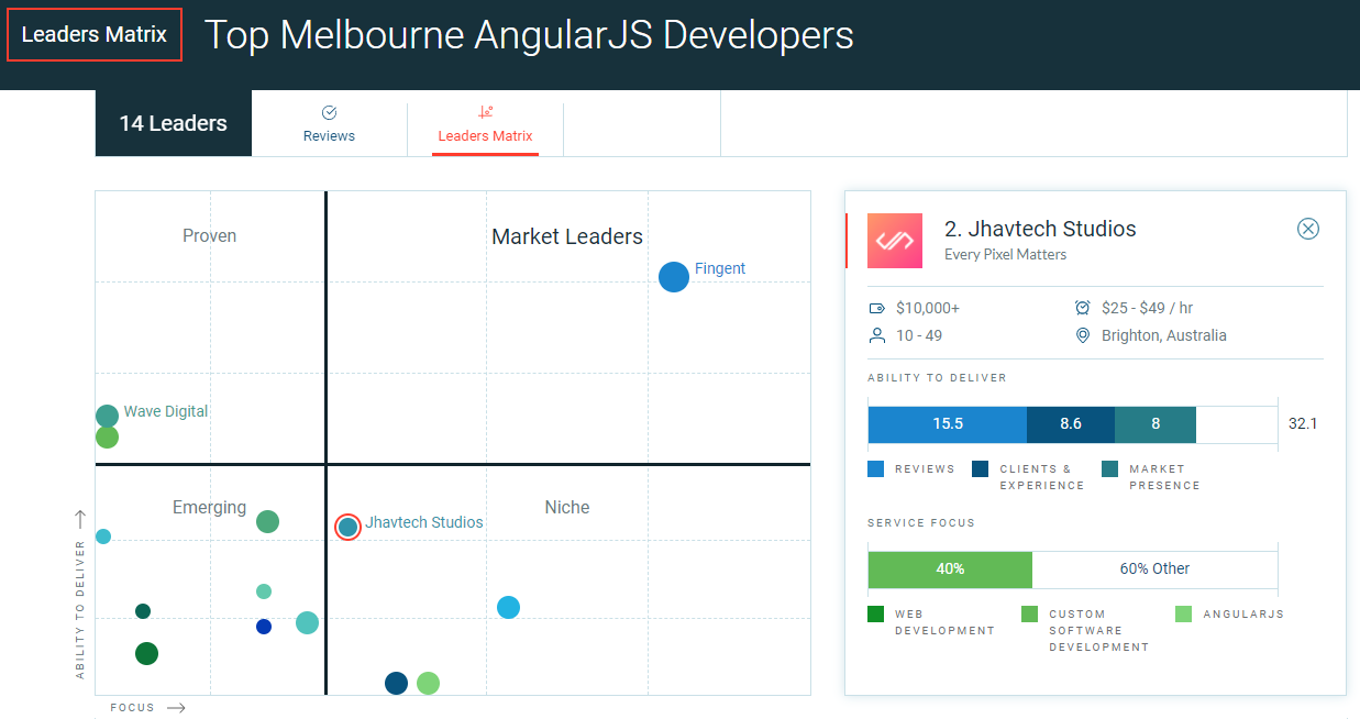 Clutch’s recent evaluation shows that we are among the leading service providers for AngularJS development. Jhavtech Studios is featured as the second leading agency in the category on Clutch’s Leaders Matrix. This award was based on our service focus, ability to deliver, and the feedback of our clients.