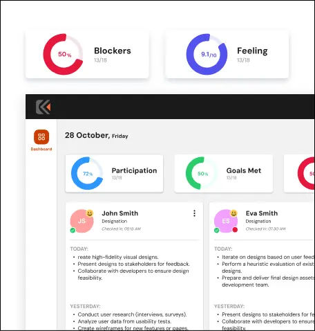 The dashboard provides an at-a-glance summary of team activities, blockers, and moods for quick decision-making.