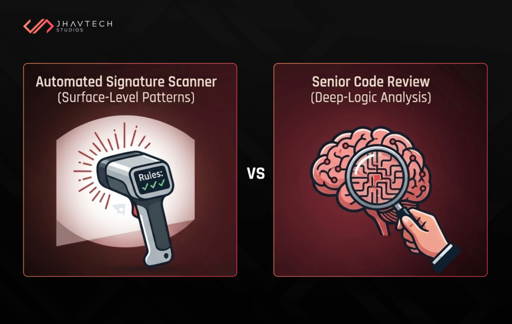 However, a syntactically perfect codebase can still be functionally broken. Automation is exceptional at identifying what is wrong based on historical data and rigid rulesets, but it cannot reliably determine what is missing or misinterpreted within a specific business context. This gap or the distance between what the code says and what the developer intended, is where a senior-led code review service adds its primary value.